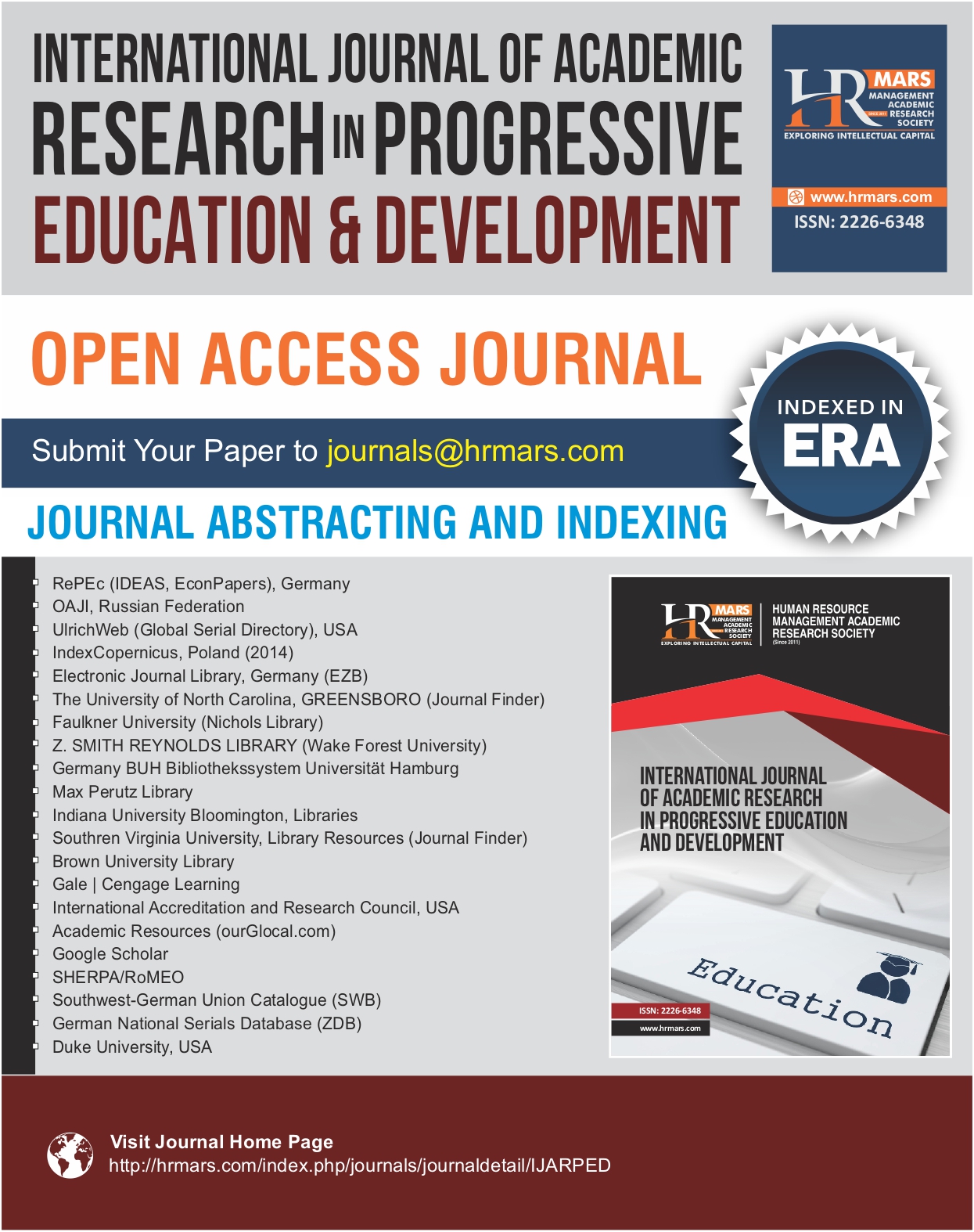 The IJ-ARPED (ISSN: 2226-6348) is an interdisciplinary open access blind peer-reviewed refereed journal that publishes significant original researches regarding different fields of Education and Research. IJ-ARPED publishes four issues per year. By providing easy access to the insights of education and research, case studies and researches, IJARPED aims to extend and supplement the knowledge of scholarly world. Education is used to shape up character and morale of society and it has influential effect over the thoughts, characters, and physical abilities of individuals. The major goal of this journal is to provide a platform where scholars, academicians, professors, intellectuals, researchers, teachers, and students can share their valued work and creative knowledge and information can be shared as well. Moreover the great heap of knowledge, values, skills, and creative thoughts can be transmitted from one generation to other. This journal covers huge mass of glaring topics which includes child development, curriculum, reading comprehension, philosophies of education and educational approaches, and others. Broad topics coverd by IJARPED are